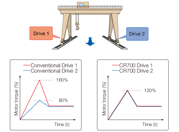 The CR700 is optimized to combine the required power gained from all travel drives to overcome friction forces during travel in Open Loop Vector Control. This feature solves the problem of overloading one motor due to an unbalanced load and minimizes the risk of mechanical wear by distributing the load impact across multiple drives.