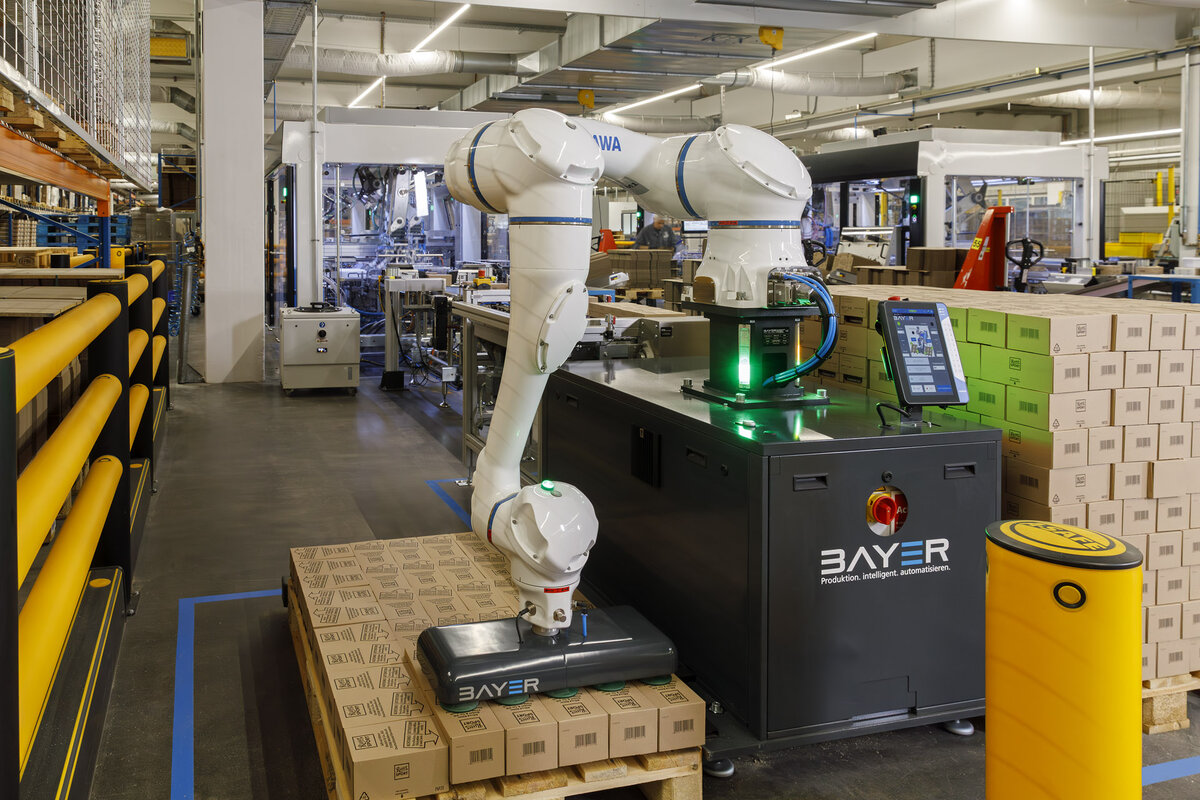Monotonous, physically demanding activities such as classic palletizing tasks are typical jobs that are now difficult to fill in the increasing competition for workers. At the same time, they are difficult to automate decentrally. It is precisely for this specific market need that Wörnitz-based Bayer GmbH & Co KG developed its safety guard-less PLT HC palletizing system. It allows for short ROI times through a standardized and modular design. Optionally equipped with a camera system, it can also be used for machine assembly applications.